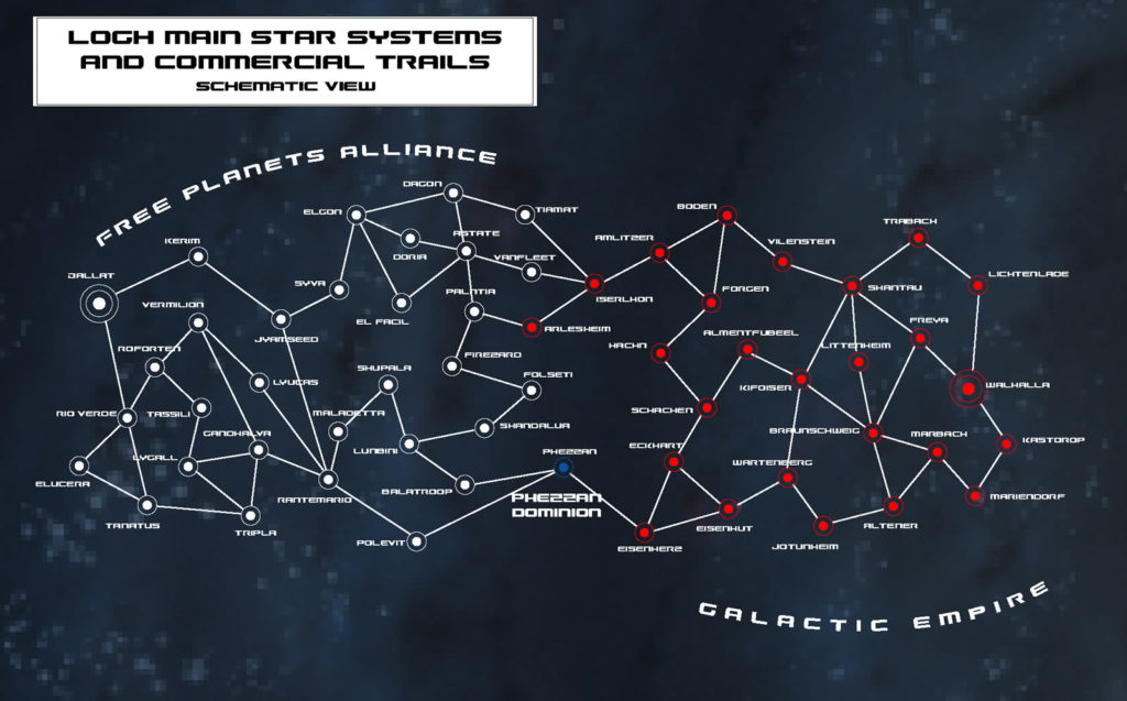 On est dans le futur. Loin dans le futur. Je vais pas vous sortir de dates parce qu’en vrai tout le monde s’en tape avant de se lancer dans l’aventure. Sachez juste qu’on est au moins au delà de l’année 3200 selon notre calendrier, et que l’humanité est partie conquérir les étoiles. Vous découvrirez comment au cours de la série mais sachez juste que lorsqu’elle commence, deux blocs s’affrontent : l’Empire Galactique et l’Alliance des Planètes Libres. Comme vous pouvez le voir sur la carte ci-dessus, les deux sont séparés par deux systèmes. L’un d’eux est contrôlé par l’Empire via la forteresse d’Iserlohn (un genre d’étoile noire imprenable) et la nation neutre de Fezzan. L’Alliance est dépeinte comme une démocratie embourbée dans la corruption et la bureaucratie, avec des militaires en bêret, et l’Empire, lui, est pas mal calqué sur la monarchie prusse dans l’esprit.