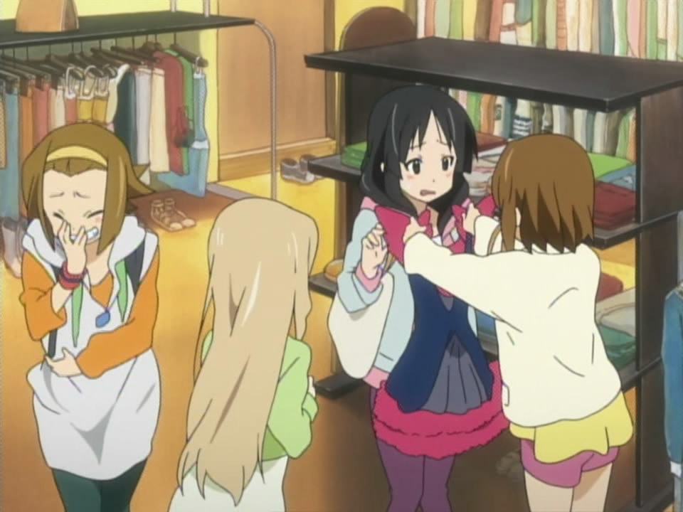 Ritsu elle, c’est la batterie son truc, et on imagine bien pourquoi: son caractère énergique mène les autres et fournit le rythme sur lequel les autres devront s’accorder pour jouer. Qui dit energique dit aussi sacrément stupide. Elle se fera d’ailleurs reprendre par Mio comme pour un duo boke-tsukkomi (un type de duo comique japonais: le boke est bête et le tsukkomi intelligent et qui reprend l’idiot chaque fois.) C’est aussi elle qui a absolument voulu ressuciter le club de musique.