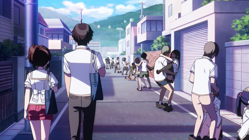Notre héros Junnosuke retourne sur cette île où il a vécu enfant, en compagnie de sa jeune sœur. Ils vont vivre dans la maison de leurs grands parents décédés et découvrir les us et coutumes de cette île où le sexe est permis à tout endroit et tout moment de la journée. L’anime y va donc à fond en contournant la censure habituelle autant que possible en montrant des scènes de cul sans aucun sens (genre les étudiants baisent après la fin des cours dans les salles de classe) comme si on était dans un mauvais hentai mais légal. Parce qu’il s’agit de ça bien évidemment.