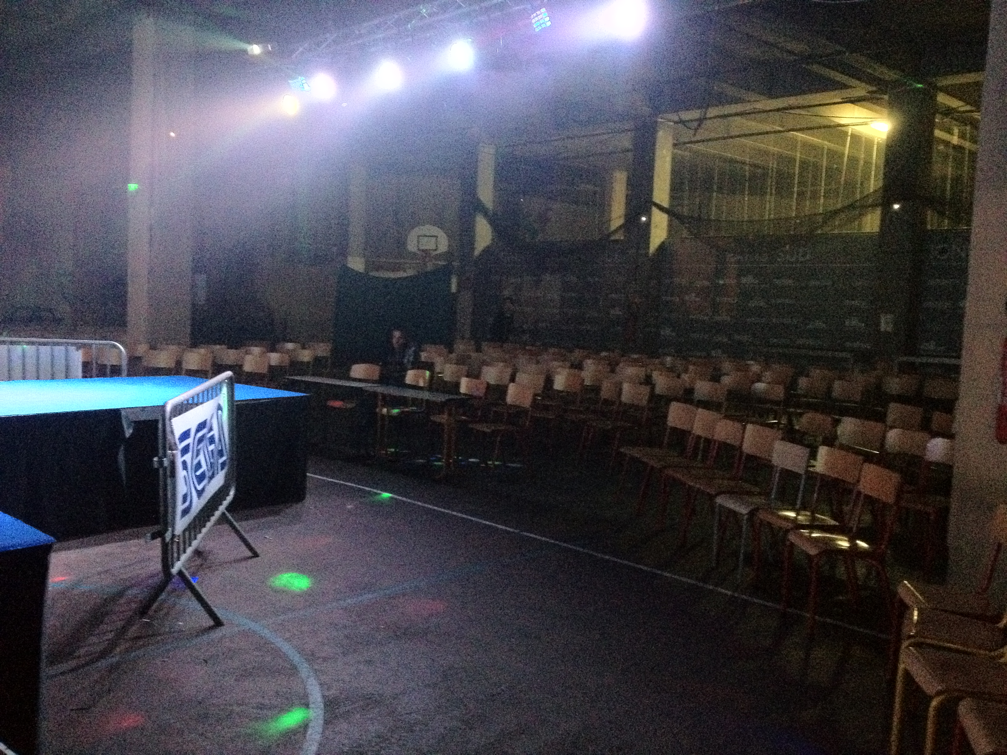Cette année, le staff a donc dû composer avec les moyens du bord : pas d’écran géant parce que ça coûte un bras (voire même deux) ce qui veut dire qu’il fallait déplacer la scène pour avoir un semblant de visibilité sur un vidéo projecteur. Le sous-sol a donc été choisi pour acceuillir la scène. On va revenir tout à l’heure sur tout ce que ça implique. Le problème avec la scène en sous-sol, c’est qu’en l’absence de lumières l’endroit était assez glauque. Propice aux grandes projections, mais moins pour ce qui est des animations organisées par les associations. Un exemple ?