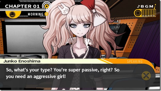 Commençons donc par celle-ci : on incarne Komaru Naegi. Ce nom devrait vous dire quelque chose si vous avez fait le premier épisode, car il s’agit de la soeur du héros, Makoto Naegi emprisonné à Hope’s Peak Academy. On voit d’ailleurs la frimousse de Komaru brièvement dans une vidéo que Makoto visionne dans les premiers chapitres. Bref, Komaru est emprisonnée dans un appartement d’où elle ne peut pas sortir. On lui livre à bouffer et tout, mais voilà, elle n’a aucune idée ou presque de ce qui se passe. On devine qu’elle a été emprisonnée avant que Makoto et ses camarades ne se réveillent dans Danganronpa 1.